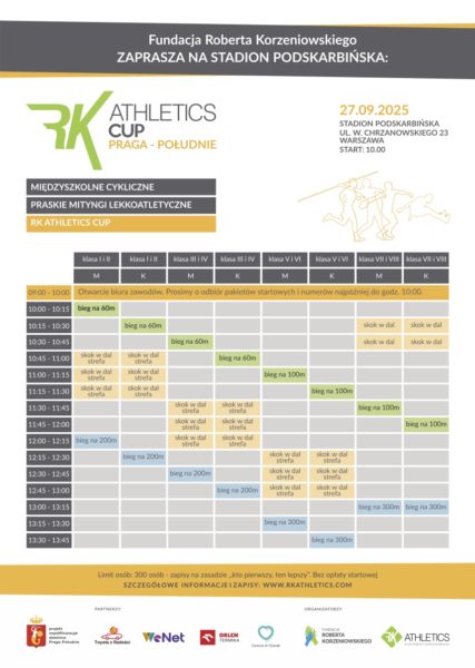 Już 27 września 2025 roku na stadionie Podskarbińska (dawny Orzeł) przy ul. Chrzanowskiego 23 w Warszawieodbędzie się pierwsza edycja Międzyszkolnego Cyklicznego Praskiego Mityngu Lekkoatletycznego – RK Athletics CUP.